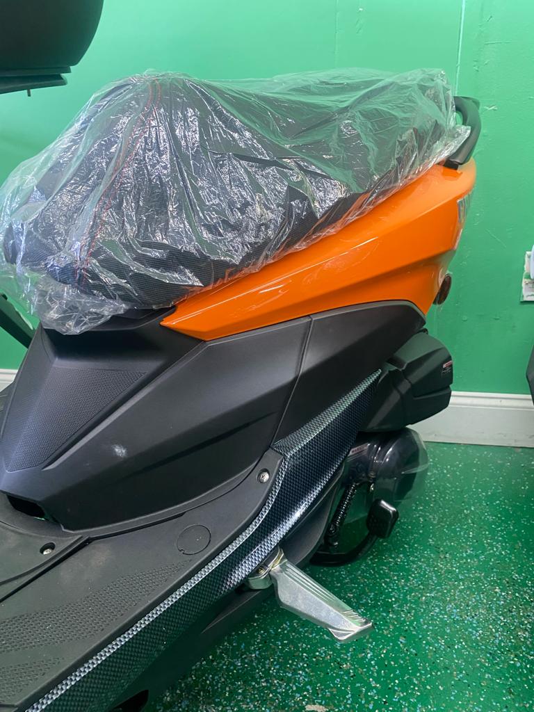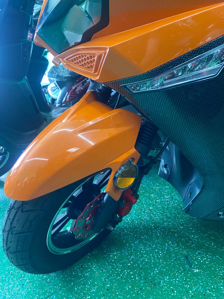 To ensure you’re seen on the streets, this model features bright and bold hues that demand attention. The front and rear LED lights provide extra illumination, while the sharp front hood and sporty body give the product an avant-garde and daring appeal. The carbon-fiber-styled trims add a modern touch to the scooter.