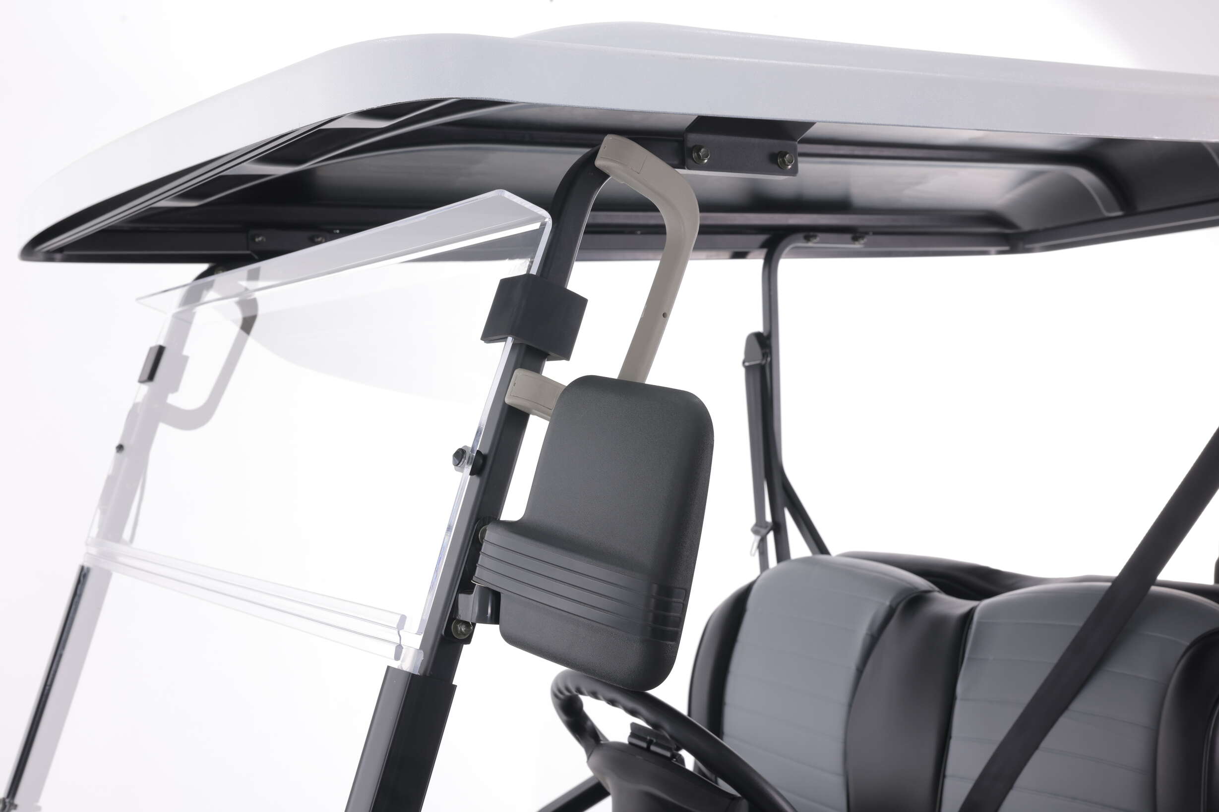 res and storage to accommodate everyone. From the front to the back, no detail was overlooked. No matter the weather, the Champ can be enjoyed rain or shine. With a full-length roof and foldable windshield, you can take cover from the rain or enjoy the summer breeze. Exceeding in comfort and safety, the Champ provides each passenger with premium seating, safety belts, and grab bars. Only two of you along for the ride? The rear-facing seats easily transform into a convenient flip deck so you never have to leave anything behind. Not only for storage, the compartment under the rear seats can also be utilized as a cooler, complete with a drain plug for easy cleanup. Fully electric with a 48V 5KW motor, the Champ boasts plenty of power to keep the fun going for hours, even after the sun goes down. LED Turn signals, headlights, and tail lights allow for plenty of visibility, and the colorful display screen lets you know when it’s time to call it a day. Innovative of its kind, the Champ comes stocked with rear drum brakes, so you’ve got plenty of stopping power exactly when you need it. Available in gray or white with sleek decals, the Champ is ready to take you on a brand-new adventure.
